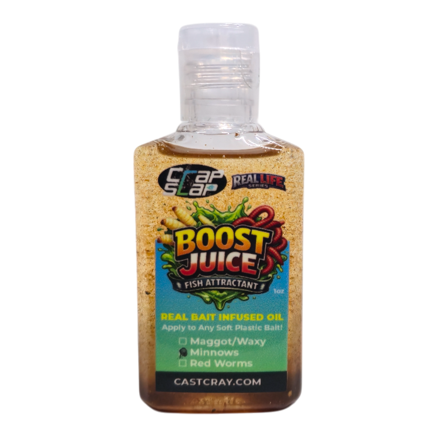 Part of the Crap Slap by Cast Cray – Real Life Series, Boost Juice is designed for anglers who refuse to settle for artificial-only attractants. We use real proteins to create a potent infusion that soaks deep into your soft plastics, turning ordinary baits into fish-holding, bite-triggering weapons.